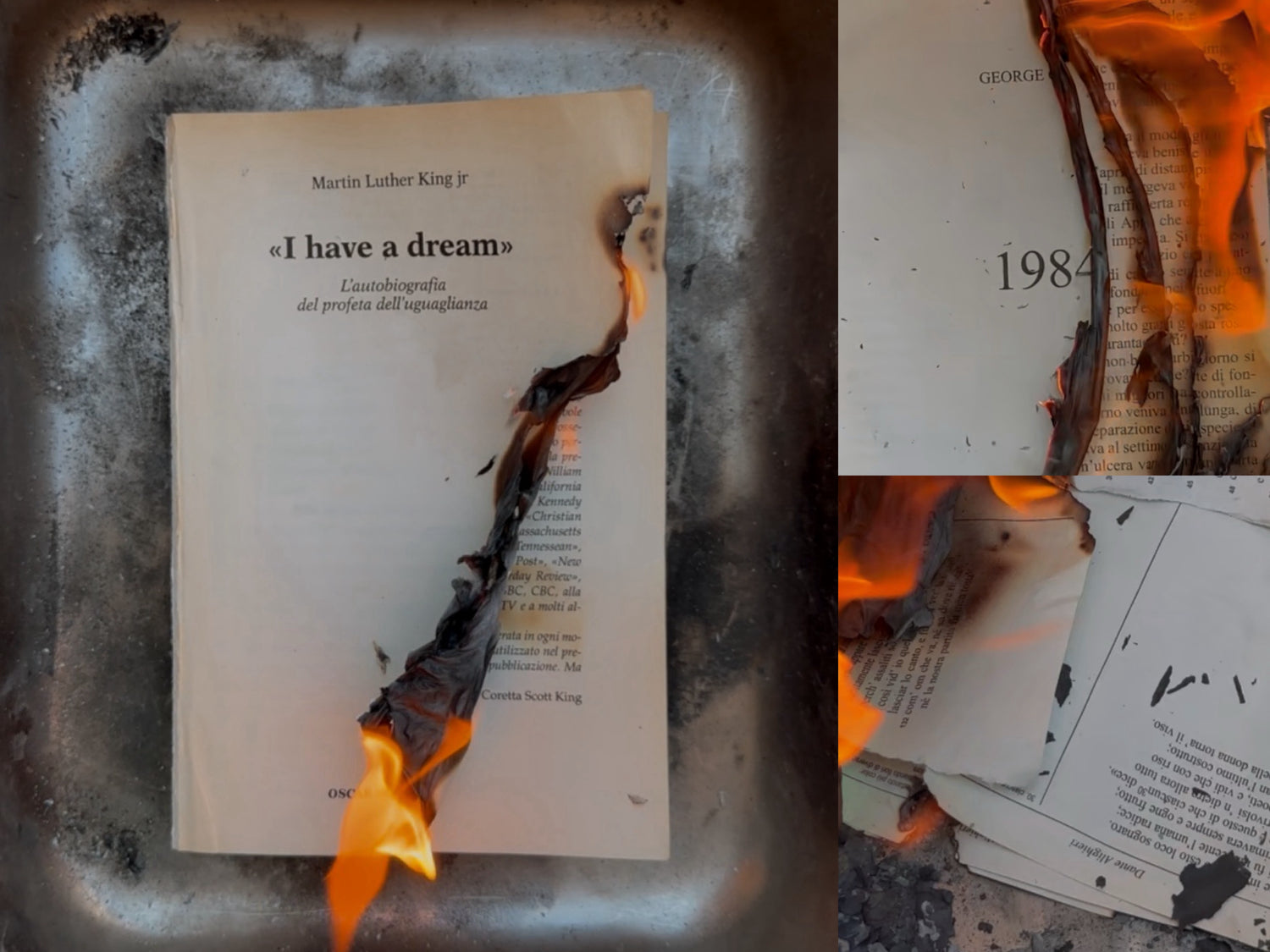 Burned books: The Divine Comedy (Dante Alighieri), Mein Kampf (Adolf Hitler), I Have a Dream (Martin Luther King Jr.), 1984 (George Orwell)