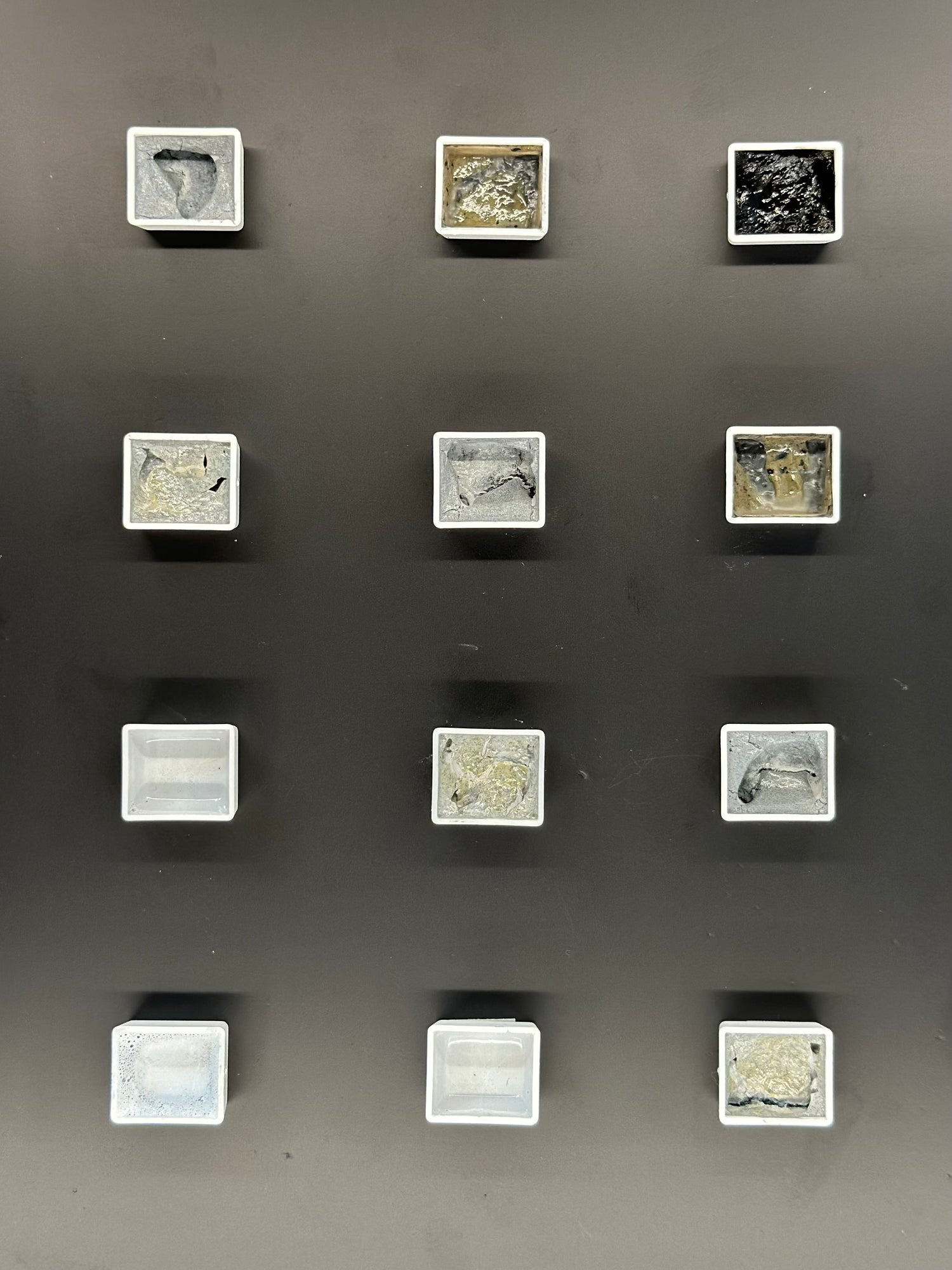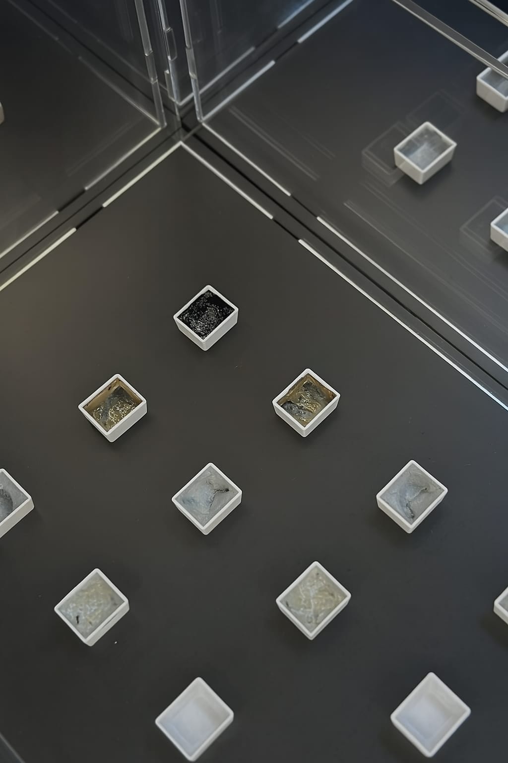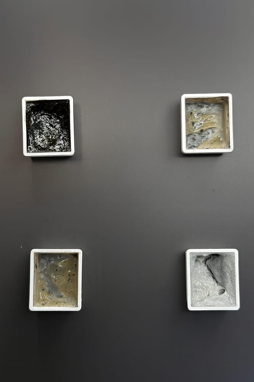 "Relax, it's not the end of the WORD: it's a palette!" is a series-based artwork that involves creating colors from the ashes of burned books. In this case, four books: The Divine Comedy, Mein Kampf, I Have a Dream, and 1984.