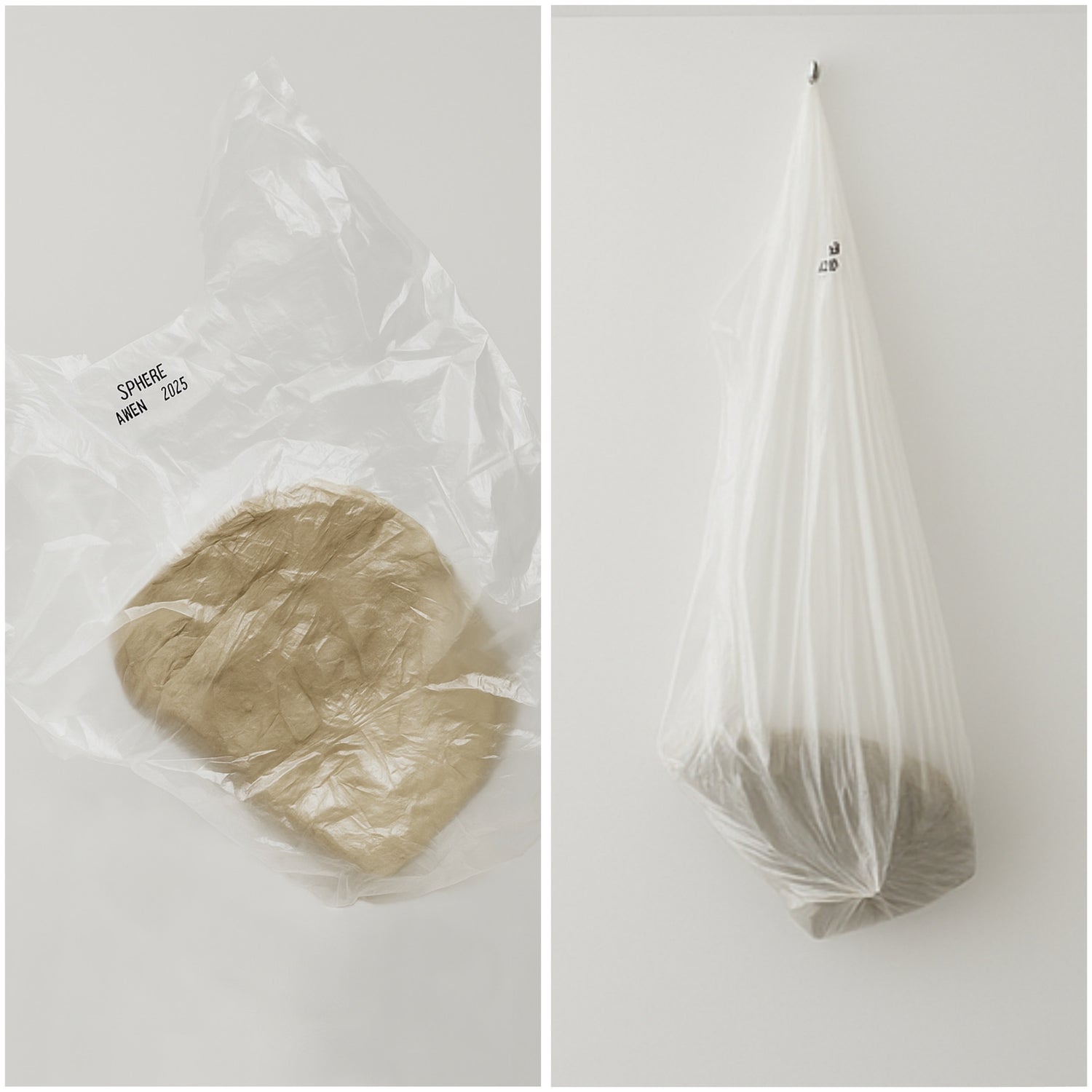 Once removed, each fragment begins to dry slowly inside a specially provided plastic bag, a material deliberately chosen in contrast with the organic, mutable nature of clay. The plastic, transparent and protective, holds the fragment as we often try to hold onto what is destined to change, suggesting an act of preservation.